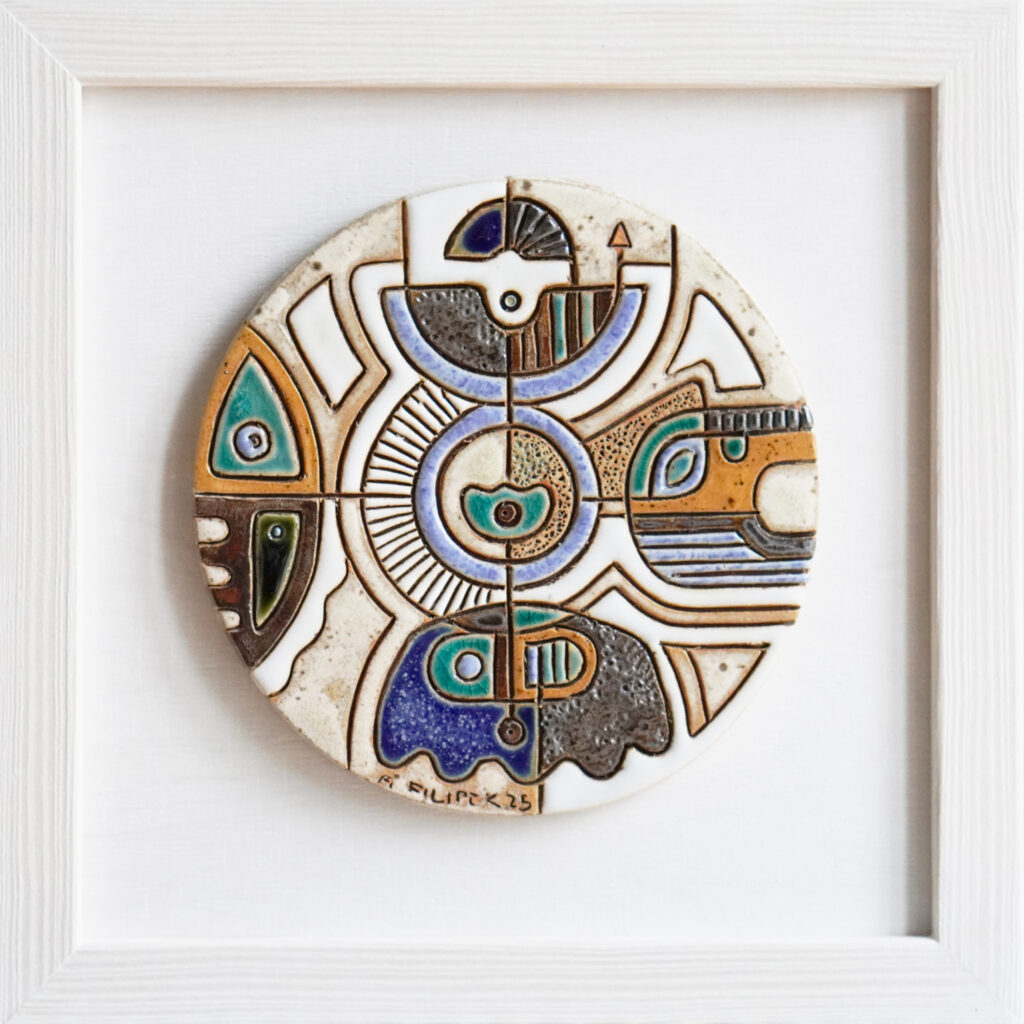 Miniatura ceramiczna z "Dzikiej" serii; Naklejona na sklejce, w drewnianej ramie; Wymiary 23 x 23cm; Rok powstania 2025; Unikatowa