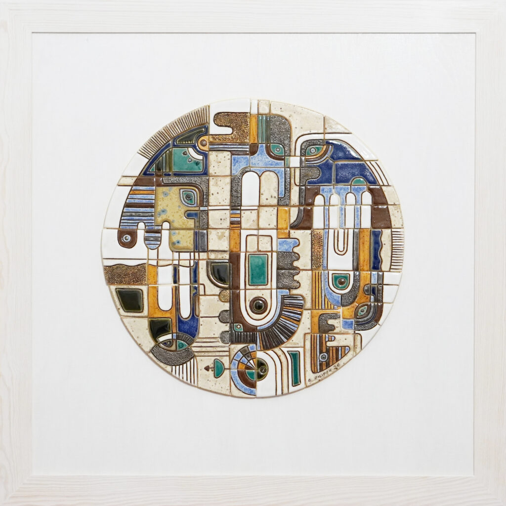 "Spotkanie na szczycie" z cyklu "Nieznany Panteon". Mozaika ceramiczna, szkliwiona, przyklejona na bejcowanej sklejce w drewnianej ramie. Wymiary 67x67 cm. Unikatowa. Rok powstania 2026