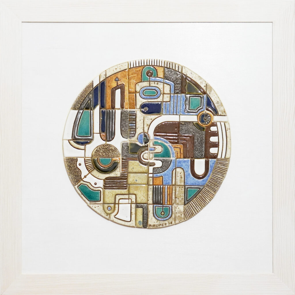"Wpływy" z cyklu "Dziwna figuracja". Mozaika ceramiczna, szkliwiona, przyklejona na bejcowanej sklejce w drewnianej ramie. Wymiary 57x57 cm. Unikatowa. Rok powstania 2026