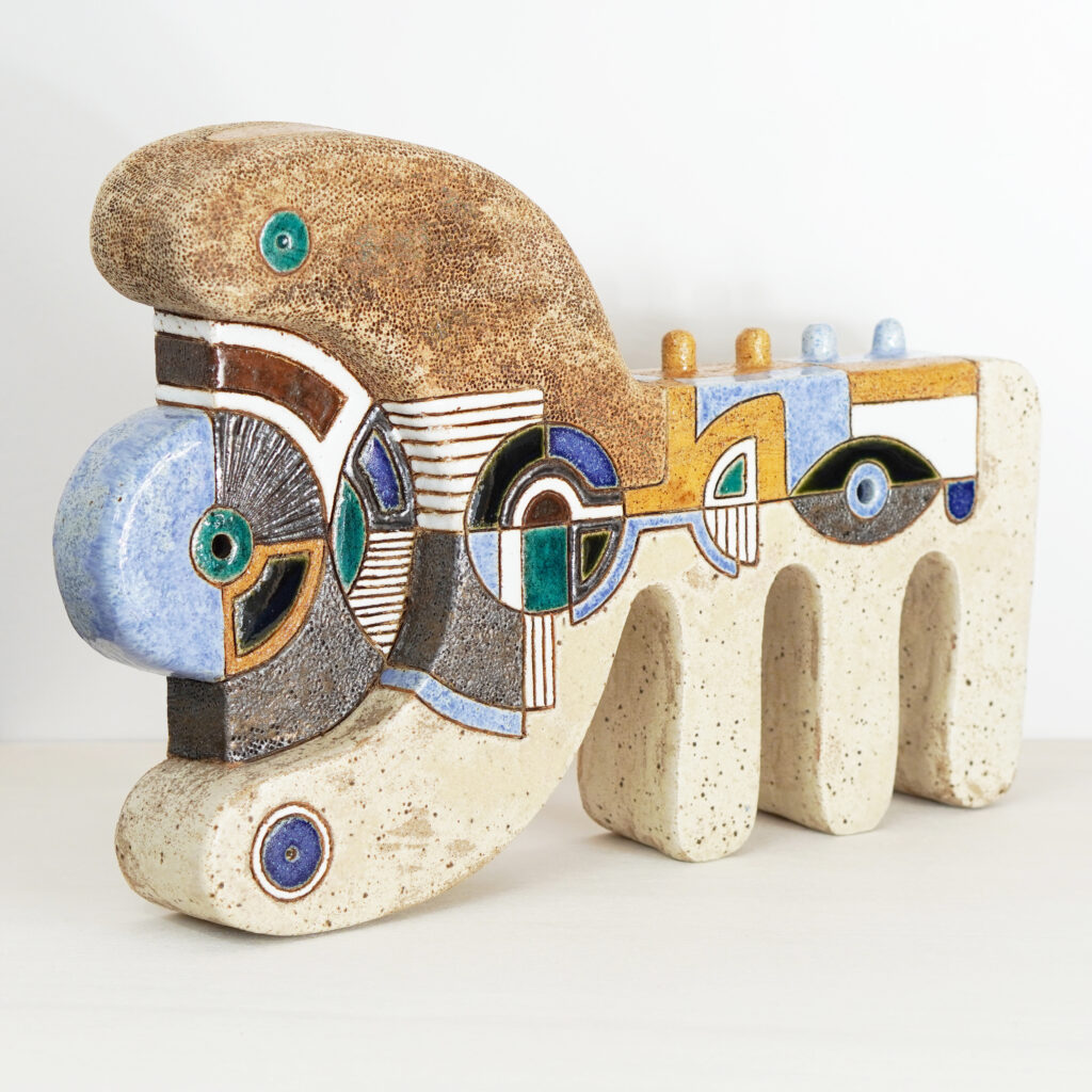 "Maczipa" z serii "Dziwna Figuracja". Rzeźba ceramiczna szkliwiona. Lepiona z ręki. Wymiary: wysokość 22,5 cm; szerokość 49 cm; szerokość boku 8 cm. Unikatowa.
